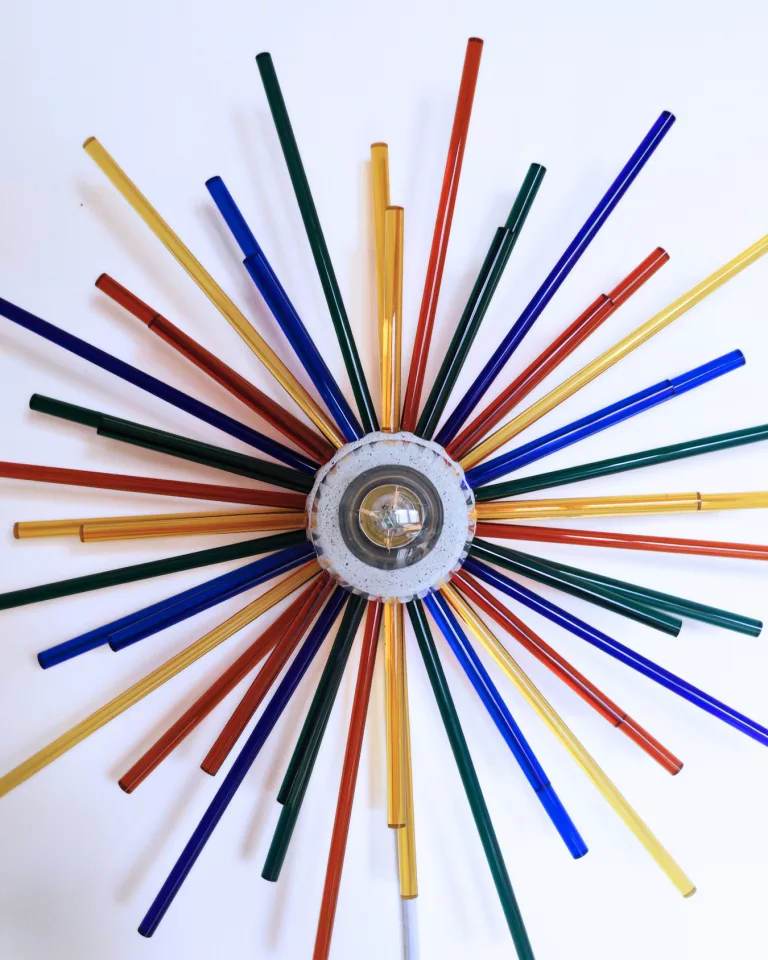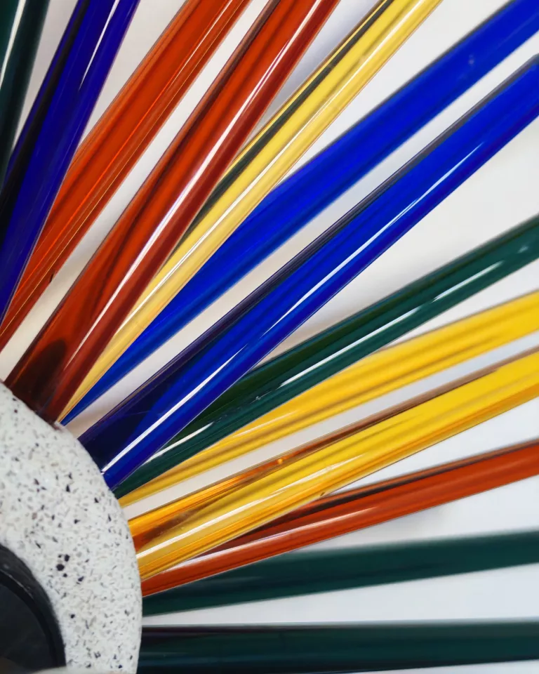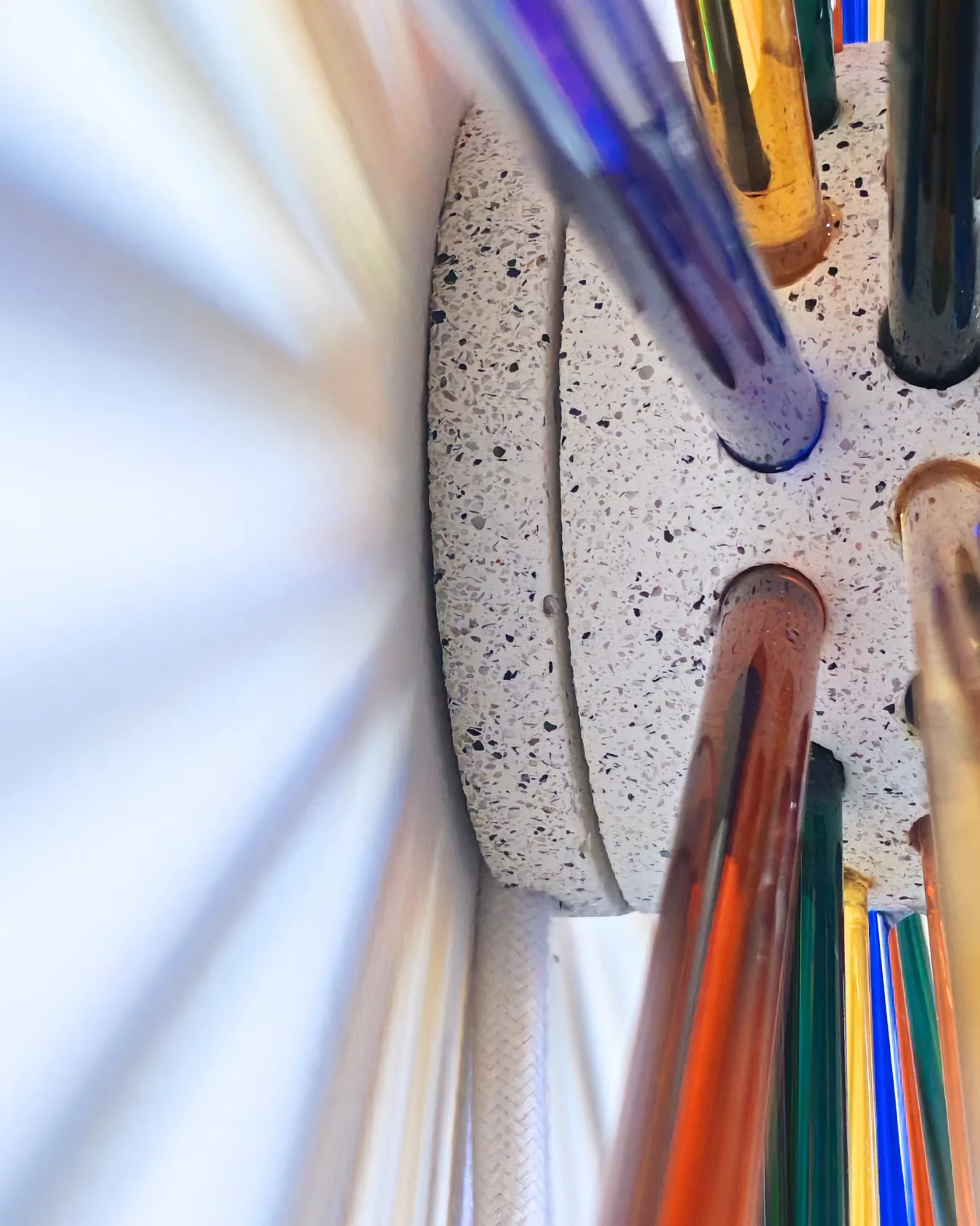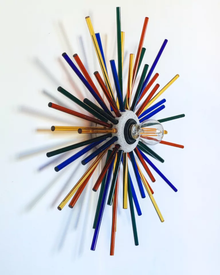AURE explores the dialogue between two opposing materials — raw, mineral granite jesmonite and fine, translucent glass. Glass rods radiate from a handmade centre, composing a living light. Entirely handmade in Brussels.