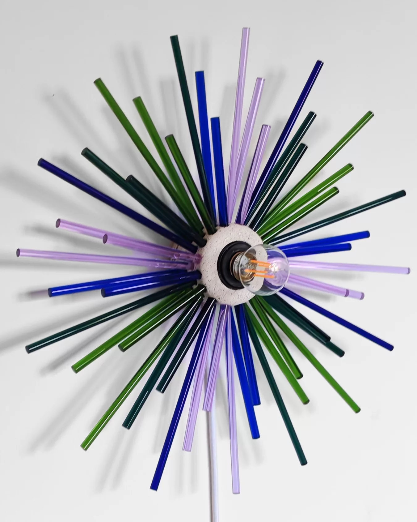 AURE explores the dialogue between two opposing materials — raw, mineral granite jesmonite and fine, translucent glass. Glass rods radiate from a handmade centre, composing a living light. Entirely handmade in Brussels.