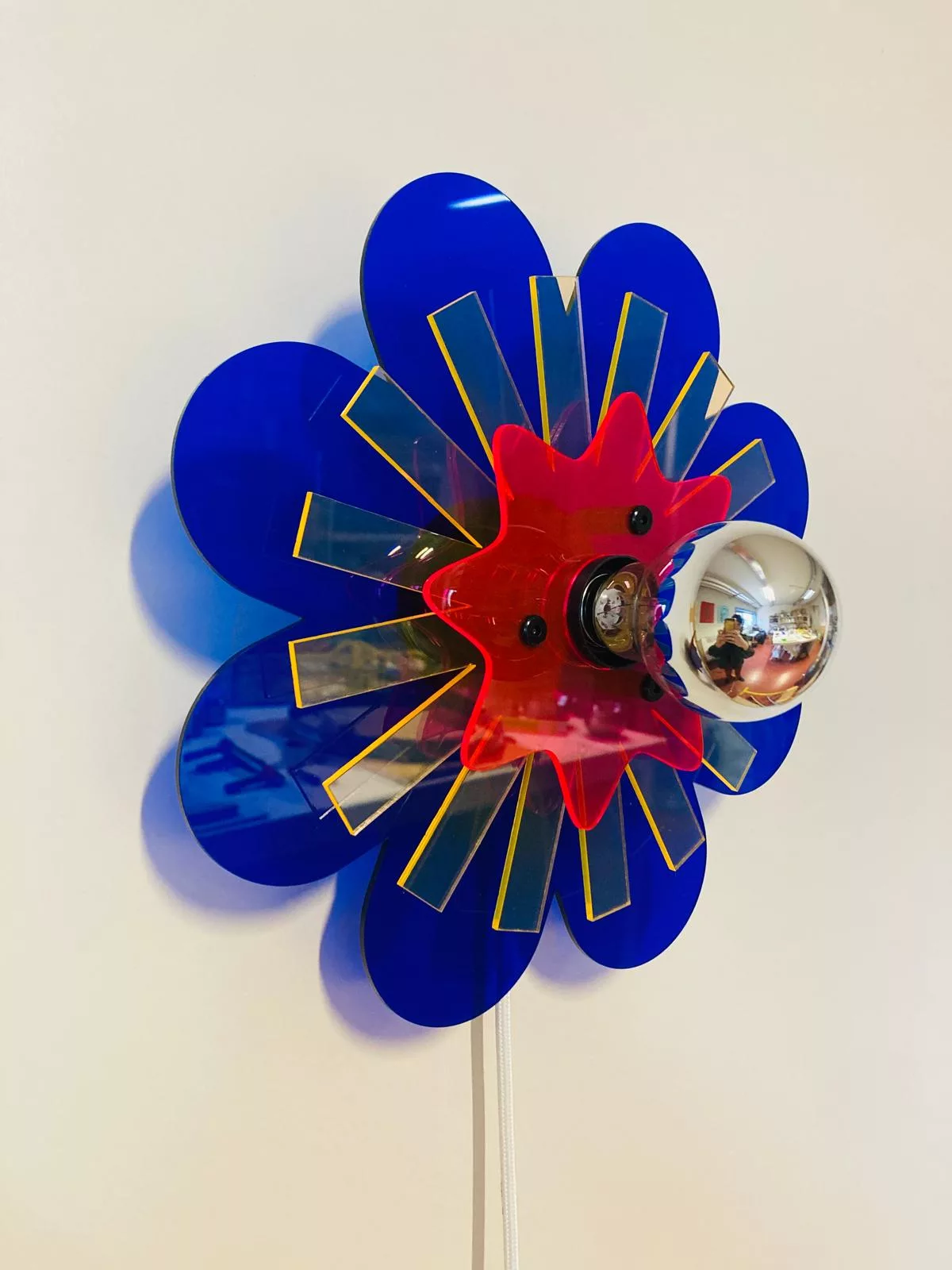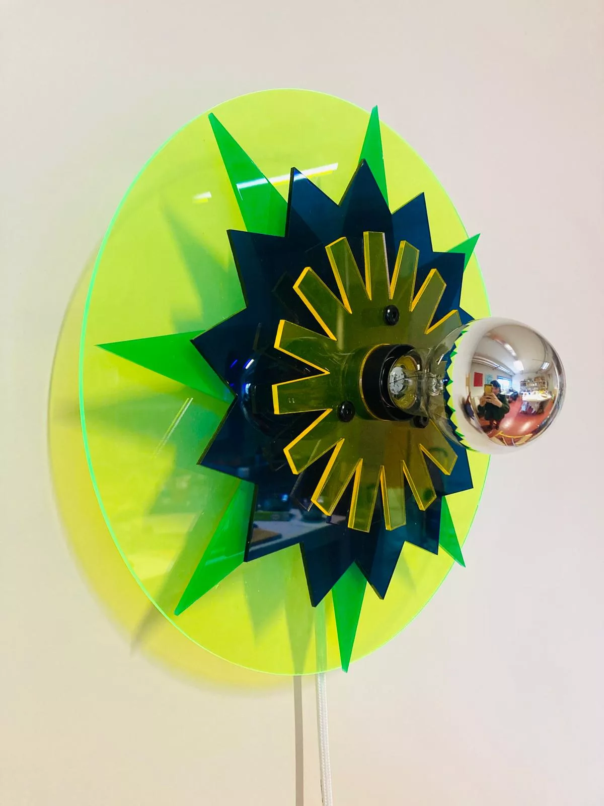 Allumée, la lampe projette un jeu d’ombres kaléidoscopiques, presque comme une composition graphique accrochée au mur.
