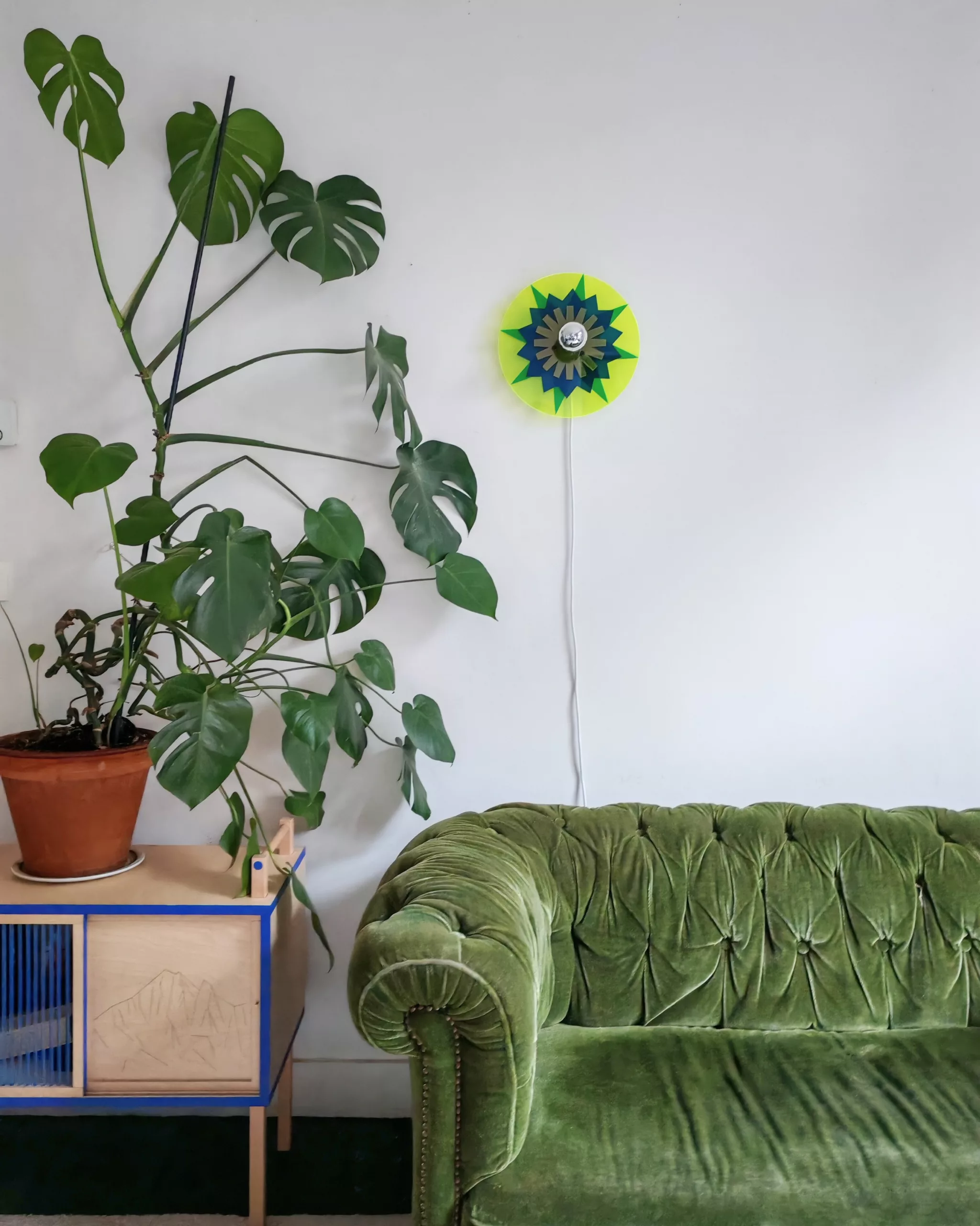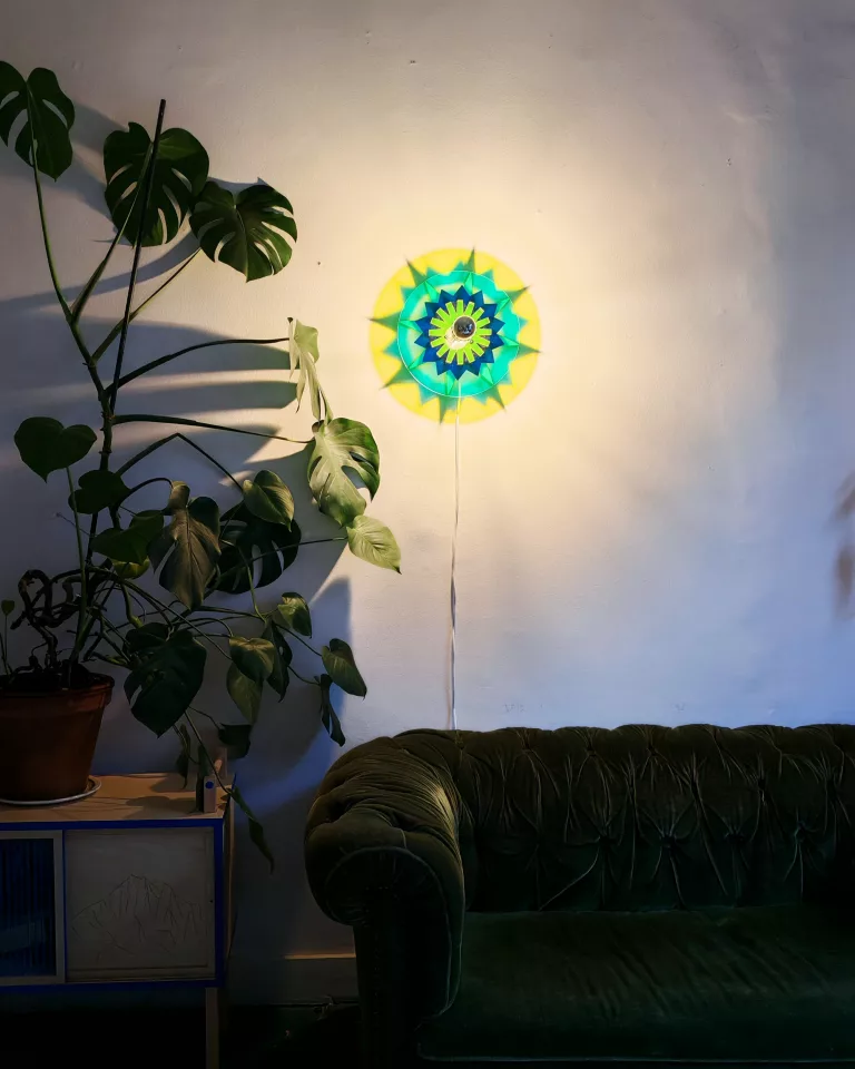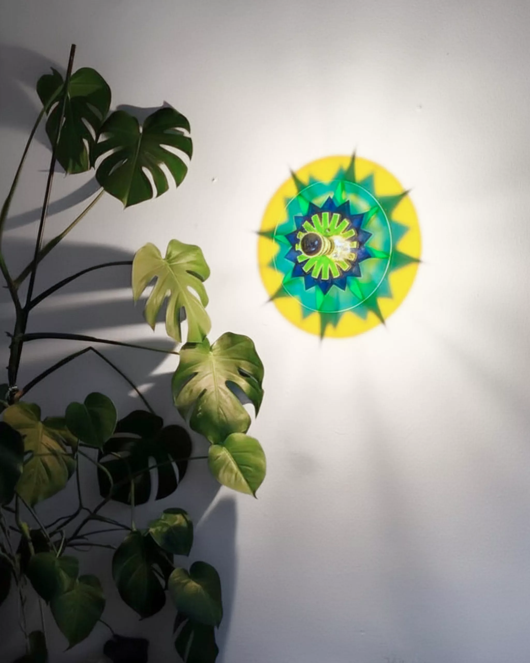 PO.YA 01 réunit quatre plans aux tonalités vertes et jaunes. La lumière traverse et se densifie, projetant des ombres graphiques sur le mur.